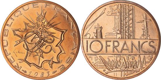 | | Coin, France, Mathieu, 10 Francs, 1983, Paris, série FDC, Tranche B, | | | Mathieu, Stylized map of france, High tension towers and electric transmission wires, denomination at center | | FEATURES |