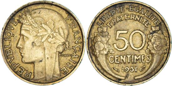 | | Coin, France, Morlon, 50 Centimes, 1931, Paris, , Aluminum-Bronze | | | Morlon, Laureate head left, Denomination above date, cornucopias flank | | FEATURES |