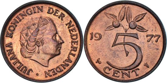 | | Coin, Netherlands, Juliana, 5 Cents, 1977, , Bronze, KM:181 | | | Head right, Value divides date and orange branch | | FEATURES |