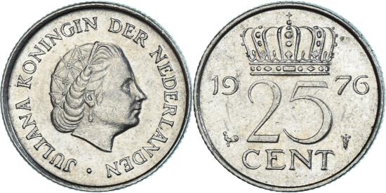 | | Coin, Netherlands, Juliana, 25 Cents, 1976, , Nickel, KM:183 | | | Head right, Crowned value divides date | | FEATURES |