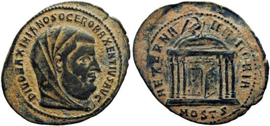 Divus Maximianus. Died AD 310. Æ Follis (24.5mm, 5.00 g, 12h). Ostia mint, 2nd officina. Struck under Maxentius, AD 310-312. Veiled head right / Domed hexastyle shrine, with door ajar and surmounted by eagle standing right, head left, with wings spread; MOSTS. RIC VI 26; Drost 79/8. Good VF. |