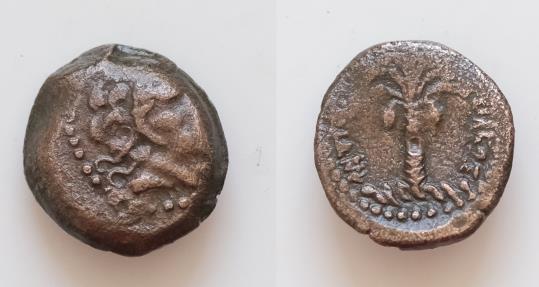 | Seleukid Kings of Syria, Antiochos III The Great, 222 - 187 BC AE15mm Dilepton, Tyre Mint, 16mm, 3 grams Diademed head of Antiochos right. Palm tree with two bunches of dates |