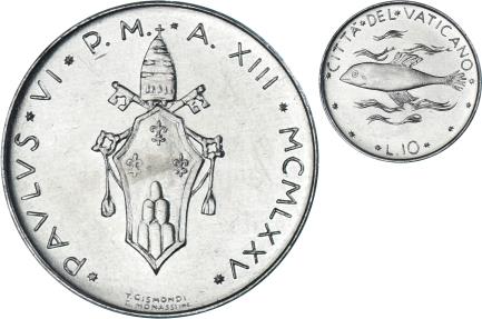 | | Coin, VATICAN CITY, Paul VI, 10 Lire, 1975, , Aluminum, KM:119 | | | Crowned shield, Fish | | FEATURES |