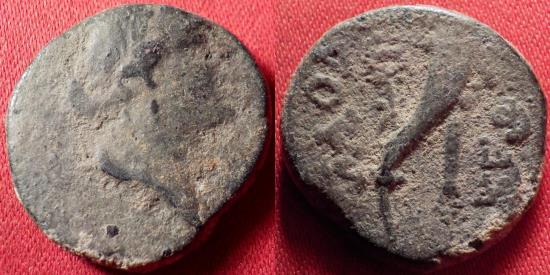 LAODIKEIA AD LYCUM, Phrygia, AE 19mm. 133 BC. Laureate, draped bust of Laodice or Aphrodite right. Reverse - ΛAOΔIKEΩN, single cornucopia, caduceus behind it. Walcher coll. 2789; SNG Cop 501-502; BMC 40-43; SNG Tuebingen 4127; SNG Munich 345-346. 19mm, 5.8g. |