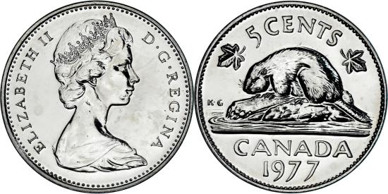 | | Coin, Canada, Elizabeth II, 5 Cents, 1977, Royal Canadian Mint, Ottawa | | | Queen's bust right, Beaver on rock divides date and denomination, Arnold Machin | | FEATURES |