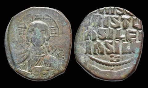 Anonymous Basil II and Constantine VIII (976-1025AD) Anonymous follis, Class A2- 10,29 gram- 25 mm, Constantinople mint Obv: [+Є]MMA- NOЧ[HΛ]. Nimbate bust of Christ facing, wearing tunic and pallium, raising his right hand in benediction and holding book of Gospels in his left; in fields, IC [XC] Rev: +IҺSЧS [X]RISTЧS bASILЄЧ bΑSILЄ in four lines, ornament below SB 1813 |