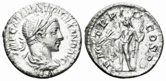 Severus Alexander. 222-235 AD. AR Denarius (2.93 gm, 19mm). Rome mint. Struck 223 AD. Obv.: IMP C M AVR SEV ALEXAND AVG, laureate and draped bust right. Rev.: PM TRP II COS PP, Jupiter stg. l. Holding cornucopiae and scepter. RIC 19; Cohen 229. gVF.