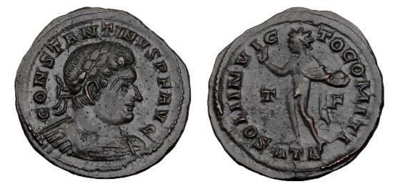 Reverse: SOLI INVICTO COMITI, Sol standing facing, head to left holding globe, ATR in ex.
