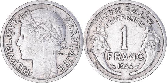 | | Coin, France, Morlon, Franc, 1944, , Aluminum, KM:885a.1, Gadoury:538a | | | Morlon, Laureate head left, Cornucopias flank denomination and date, Thick and thin planchets exist. | | FEATURES |
