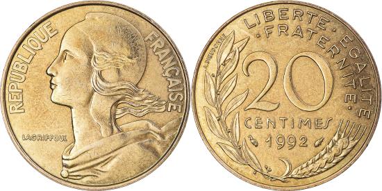 | | Coin, France, Marianne, 20 Centimes, 1992, , Aluminum-Bronze, KM:930 | | | Marianne, Liberty bust left, Denomination above date, grain sprig below, laurel branch at left, Without mint mark. 1991-1993 dated coins, non-Proof, exist in both coin and medal alignment., Henri Lagriffoul | | FEATURES |