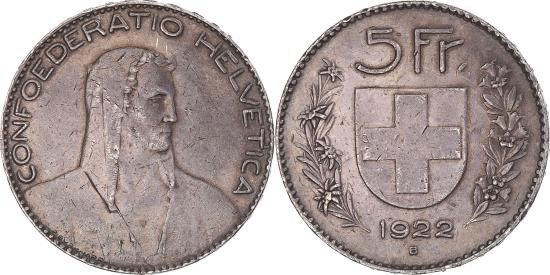 | | Coin, Switzerland, 5 Francs, 1922, Bern, , Silver, KM:37 | | | William Tell right, Shield flanked by sprigs | | FEATURES |