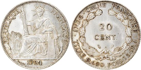| | Coin, FRENCH INDO-CHINA, 20 Cents, 1924, Paris, , Silver, KM:17.1 | | | Seated liberty left, date below, Denomination within wreath | | FEATURES |