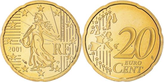 | | France, 20 Euro Cent, 2001, Paris, , Brass, Gadoury:5., KM:1286 | | | The seed sower divides date and RF, Denomination and map, Laurent Jorb | | FEATURES |