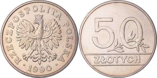| | Coin, Poland, 50 Zlotych, 1990, Warsaw, , Copper-nickel, KM:216 | | | Crowned eagle with wings open, date below, Value with sprig in 0 | | FEATURES |
