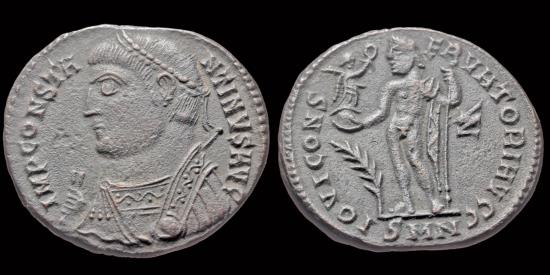 Constantine I the great (307-337AD) Billon follis- 3,45 gram- 18 mm, Nicomedia mint obv: IMP CONSTANTINVS AVG, laureate and draped bust to left, holding sceptre in right hand and mappa in left hand rev: IOVI CONSERVATORI AVGG, Jupiter, nude, chlamys draped across left shoulder, standing left, holding Victory on globe in right hand and leaning on sceptre with left hand, W in right field, SMN in exergue RIC 23 |