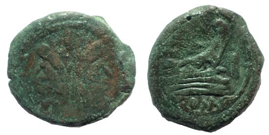 Roman Republic, Ae As, uncertain mint. Æ 32 mm. 20.5 gm. Obv: Laureate head of Janus; above, mark of value. Rev: Prow r.; above, _N. Before, mark of value and below, ROMA.