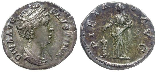 Title: Diva Faustina I (died AD 141) AR Denarius / Pietas