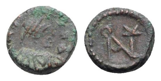 Anastasius I (491-518). Æ Nummus (10mm, 1.20g, 6h). Constantinople, 491-498. Diademed, draped and cuirassed bust r. R/ Monogram of Anastasius. MIBE 40; DOC 15; Sear 13. VF