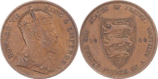 | | Coin, Jersey, Edward VII, 1/24 Shilling, 1909, London, , Bronze, KM:9 | | | Crowned bust right, Pointed shield divides date, G. W. DeSaulles | | FEATURES |