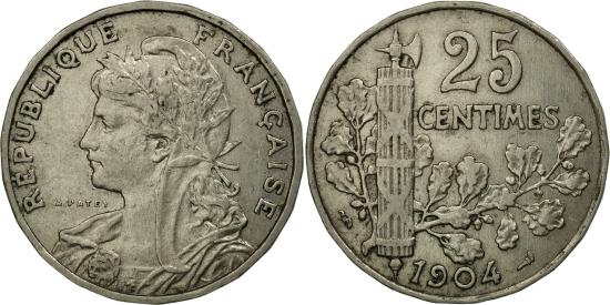| | Coin, France, Patey, 25 Centimes, 1904, , Nickel, KM:856, Gadoury:364 | | | Patey, Laureate bust left, Oak leaves divide date and denomination, column with axe head on top at left | | FEATURES |