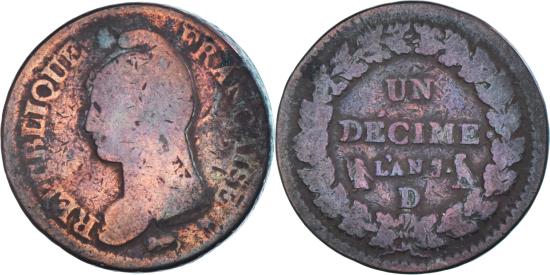 | | Coin, France, Dupré, Decime, 1798, Lyon, , Bronze, KM:644.5 | | | Dupré, Liberty head left, Value within oak wreath | | FEATURES |