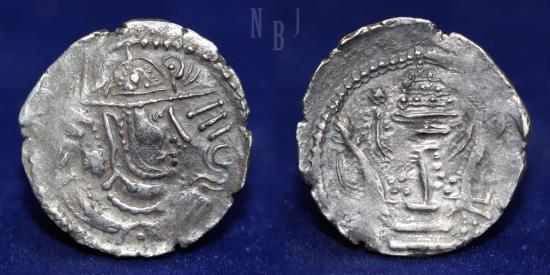 Sindh. Pre-Gujarat Series. Circa 550-650. AR Drachm, Imitating a Type 3 drachm of the Sasanian king Pērōz (Fīrūz) I, AD 457/9-484. Sasanian style bust right, wearing crown with wings / Fire altar with attandents. MACW 1480-1; Zeno 90540. Toned.