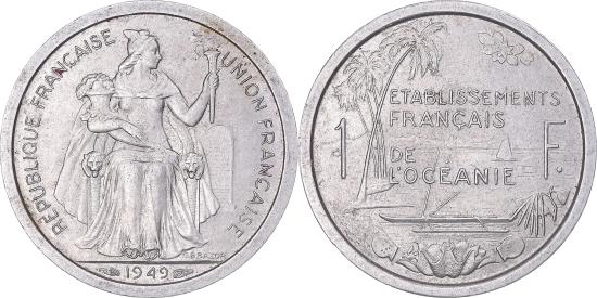 | | Coin, FRENCH OCEANIA, Franc, 1949, Paris, , Aluminum, KM:2 | | | Seated Liberty with torch and cornucopia right, date below, Inscription and island scene divide denomination, G.B.L. Bazor | | FEATURES |