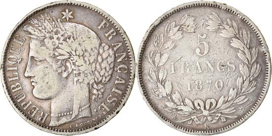 | | Coin, France, Cérès, 5 Francs, 1870, Bordeaux, , Silver, KM:818.2 | | | Cérès, E. A. OUDINE F. below truncation, Denomination within wreath | | FEATURES |