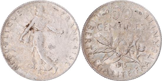 | | Coin, France, Semeuse, 50 Centimes, 1915, Paris, , Silver, KM:854 | | | Semeuse, Figure sowing seed, Leafy branch divides date and denomination, Without mint mark. | | FEATURES |