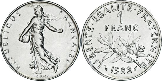 | | Coin, France, Semeuse, Franc, 1982, Paris, série FDC, , Nickel | | | Semeuse, The Seed Sower, Laurel branch divides denomination and date, Without mint mark., Louis Oscar Roty | | FEATURES |
