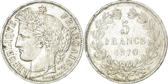 | | Coin, France, Cérès, 5 Francs, 1870, Bordeaux, , Silver, KM:818.2 | | | Cérès, E. A. OUDINE F. below truncation, Denomination within wreath | | FEATURES |