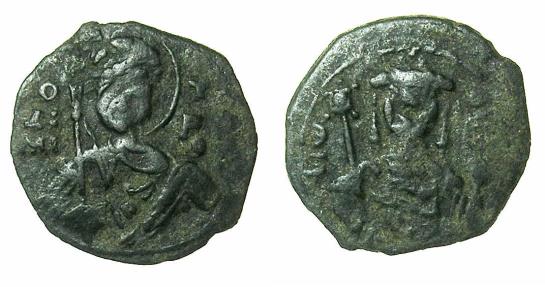 BYZANTINE EMPIRE.John II Comnenus AD 1118-1143.AE.Half Tetateron.Mint of THESSALONIKI.( 1.39g, 16.7mm, 6h ) O / ΔΗ / MH/ - T/ P(I) / O / (C), facing half length figure of Saint Demetrius, holding sword in right hand and shield in left. Reverse.+Iω- ΔΕ(C), facing half length figure of John II holding labarum in right hand and globus cruciger in left. Ref: Sear 1955. Very fine. Scarce coin; especially with most of legend on flan. Saint Demetrios is the patron saint of Thessaloniki. |