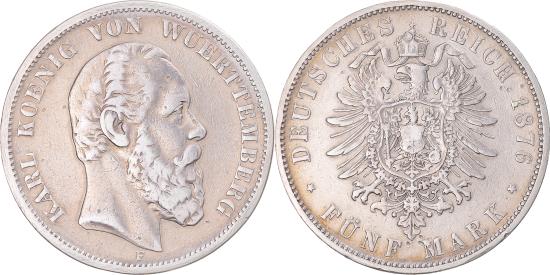 | | Coin, German States, WURTTEMBERG, Karl I, 5 Mark, 1876, Freudenstadt, | | | Head right., Crowned imperial eagle., Cleaned., KARL KOENIG VON WUERTTEMBERG | | FEATURES |