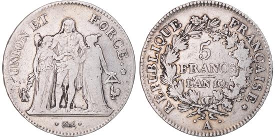| | Coin, France, Union et Force, 5 Francs, An 10, Paris, , Silver | | | Union et Force, Hercules group., Value within oak wreath., Cleaned., UNION ET FORCE <Bullet> * | | FEATURES |