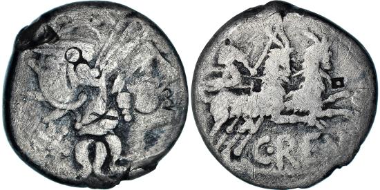 | | Coin, Renia, Denarius, 138 BC, Rome, , Silver, Crawford:231/1 | | | Juno in a biga of goats, right, wearing diadem and holding sceptre and reins in left hand and whip in right hand., C. Renius. Denarius with crystallized silver, cleaned with a product that left this black patina. Multiple countermarks, three on observe and one before the goats on reverse. | | FEATURES |