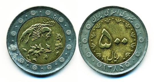 IRAN: Bimetal 500 Rials ( 27 mm), dated SH 1385 (2006), Persian mythical Bird Simorgh.