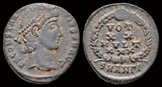 Constantius II (337-350AD) AE follis- 1,46 gram- 14 mm, struck at Antioch 347-348AD obv: D N CONSTAN_TIVS P F AVG, pearl-diademed head right rev: VOT/XX/MVLT/XXX, laurel wreath enclosing VOT/XX/MVLT/XXI, SMANΓI in exergue RIC VIII 113 LRBC II, 1398 RI11448 |