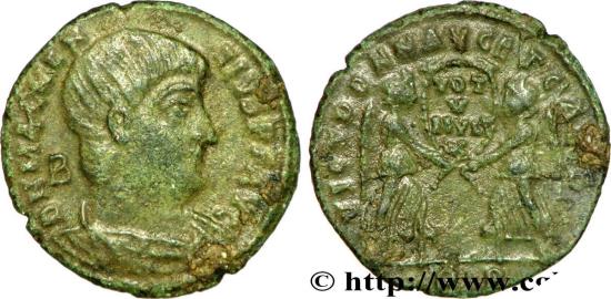 VICT DD NN AVG ET CAES/ VOT/ V/ MVLT/ X/ / RP Deux Victoires debout face à face, tenant à deux un bouclier inscrit en quatre lignes surmonté d’un chrisme