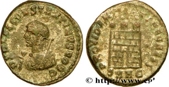 CONSTANTINE II Caesar Centenionalis ou nummus 317-320 Héraclée R1 copper Obverse : D N FL CL CONSTANTINVS IVN NOB C Buste lauré, drapé et cuirassé de Constantin II César à gauche, vu de trois quarts en avant, tenant un foudre de la main droite et un globe de la main gauche, un sceptre à l’extrémité bouletée reposant sur l’épaule (B*17) Reverse : PROVIDEN-TIAE CAESS/ -|-// MHTE Porte de camp surmontée de trois tourelles Commentary : Exemplaire sur un petit flan épais, ovale, bien centré des deux côtés. Beau portrait. Joli revers. Patine grise avec des reflets métalliques, légèrement granuleuse