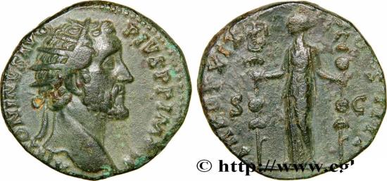Commentary : Exemplaire sur un petit flan ovale et épais, bien centré des deux côtés. Belle tête d’Antonin le Pieux. Revers inhabituel. Patine vert foncé