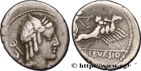 L. IVLI. BVRSIO à l’exergue Victoire dans un quadrige galopant à droite, brandissant une couronne de la main droite et tenant les rênes de la main gauche