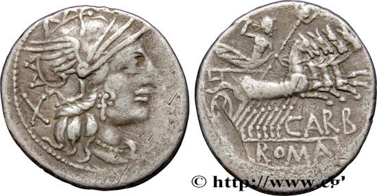 ROMA dans un cartouche à l’exergue ; M. CARB. au-dessus du cartouche Jupiter dans un quadrige galopant à droite brandissant un foudre de la main droite et tenant un sceptre et les rênes de la main gauche
