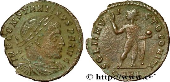 CONSTANTINE I THE GREAT Augustus Follis ou nummus 313-314 Arles R3 copper Obverse : IMP CONSTANTINVS P F AVG Buste lauré, drapé et cuirassé de Constantin Ier à droite, vu de trois quarts en avant (A*) Reverse : SOLI INV-I-CTO COMITI// QARL Sol (le Soleil) radié à demi nu, le manteau sur l’épaule, debout à droite, tournée à gauche, levant la main droite et tenant un globe de la gauche Pedigree : Exemplaire provenant de la collection A-M Schmitt-Cadet Commentary : Exemplaire bien centré sur un flan irrégulier. Joli buste et beau revers. Patine vert foncé