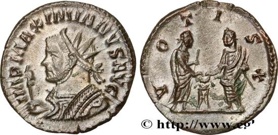 MAXIMIANUS HERCULIUS Auguste I Aurelianus 293 Lyon billon Obverse : IMP MAXIMIANVS AVG Buste radié consulaire de Maximien Hercule à gauche, vu de trois quarts en avant, tenant un scipio de la main droite (H2) Reverse : VO-TI-S X/ -|-// - Dioclétien et Maximien Hercule debout face à face, vêtus de la toge, sacrifiant au-dessus d’un trépied allumé, tenant ensemble une patère ; Dioclétien tient un sceptre court de la main gauche ainsi que Maximien Commentary : Monnaie de toute beauté ! Buste magnifique et revers d’une rare finesse. Patine grise