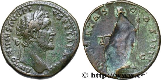 Commentary : Flan idéalement centré des deux côtés. Très beau portrait d’Antonin le Pieux. Important manque de métal au revers sur la Liberté. Patine vert foncé