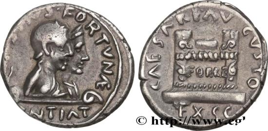 [Q. RVSTIV-S.] FORTVN(AE)// ANTIAT Bustes accolés à droite de Fortuna Victrix casquée, tenant une patère de la main droite et de Roma Felix diadémé, toutes les deux placés sur une ligne d’exergue se terminant par des têtes de bélier