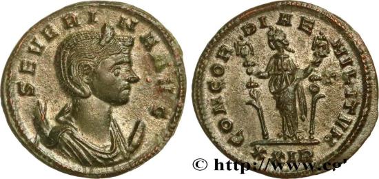 SEVERINA Wife of Aurelian - Augusta Aurelianus début - septembre 275 Rome billon Obverse : SEVERI-NA AVG Buste de Séverine, tête diadémée, à droite, drapé, posé sur un croissant, vu de trois quarts en avant (L15) Reverse : CONCORDIAE MILITVM/ -|(gamma)// XXIR Concordia (La Concorde) drapée, debout de face regardant à gauche, tenant une enseigne militaire dans chaque main Commentary : Exemplaire idéalement centré. Superbe revers, finement détaillé. La monnaie a conservé une partie de son argenture superficielle. Patine gris foncé