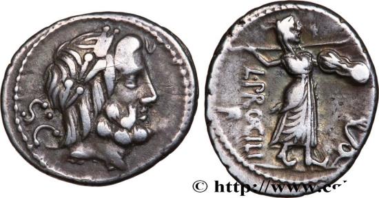 PROCILIA Denier 80 AC. Rome silver Obverse : S.C Tête laurée de Jupiter à droite Reverse : L. PROCILI/ F verticalement Junon Sospita, combattant à droite, coiffée de la peau de chèvre, brandissant une javeline de la main droite et tenant un bouclier de la main gauche ; dans le champ à droite, un serpent Commentary : Flan ovale, idéalement centré des deux côtés. Joli portrait de Jupiter. Monnaie quasi TTB+. Patine grise