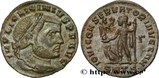 LICINIUS I Follis ou nummus 311 Thessalonique copper Obverse : IMP LIC LICINIVS P F AVG Tête laurée de Licinius Ier à droite (O*) Reverse : IOVI CONSER-VATORI AVGG/ -|(gamma)// .SM.TS. Jupiter nu, debout à gauche, le manteau sur lépaule gauche, tenant un foudre de la main droite et un sceptre de la gauche ; à ses pieds, à gauche, un aigle tenant une couronne dans le bec Commentary : Exemplaire de qualité exceptionnelle pour ce type de monnayage sur un flan ovale et bien centré avec les grènetis visibles. Très beau portrait massif. Joli revers de style fin. Belle patine gris foncé avec des reflets métalliques