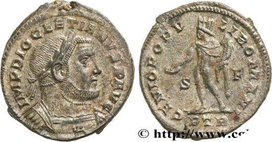 DIOCLETIAN Augustus Follis ou nummus 303-305 Trèves R1 copper Obverse : IMP DIOCLETIANVS P AVG Buste lauré et cuirassé de Dioclétien à droite avec pan de paludamentum, vu de trois quarts en avant (B*01) Reverse : GENIO POPV-LI ROMANI/ S|F// PTR Genius (Génie) debout à gauche, coiffé du modius, le manteau sur lépaule gauche, tenant une patère de la main droite et une corne dabondance de la main gauche Commentary : Très bel exemplaire, idéalement centré des deux côtés. Superbe buste de style fin. Patine grise